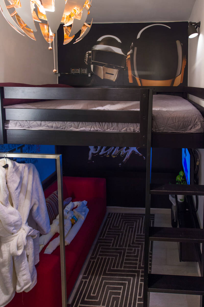 Daft Punk—a forever young genius duo known for performing in their signature helmets. With their instantly recognizable sound, Daft Punk are legends in their own right. Their lyric, “Buy it, use it, break it, fix it, trash it, change it, mail, upgrade it,” from the song “Technologic,” captures their innovative spirit. This room is designed to get you in the mood for a good time.
